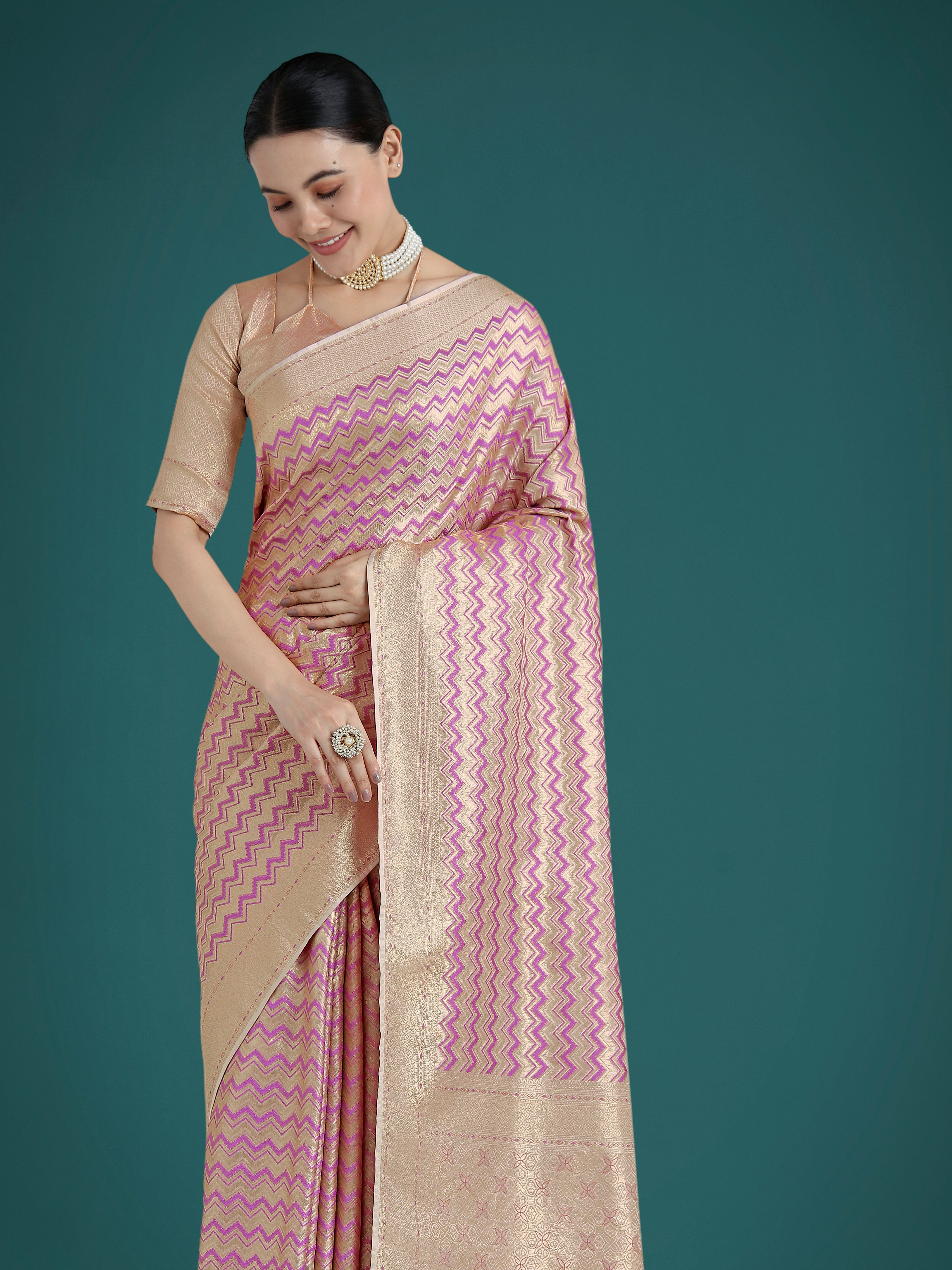Pamper the women in you with this appealing Light Lilac Banarasi satin silk classic saree. The ethnic weaving leheriya pattern with zari work in the attire adds a sign of attractiveness statement for the look. Comes with matching blouse. (Slight variation in color, fabric & work is possible. Model images are only representative.)