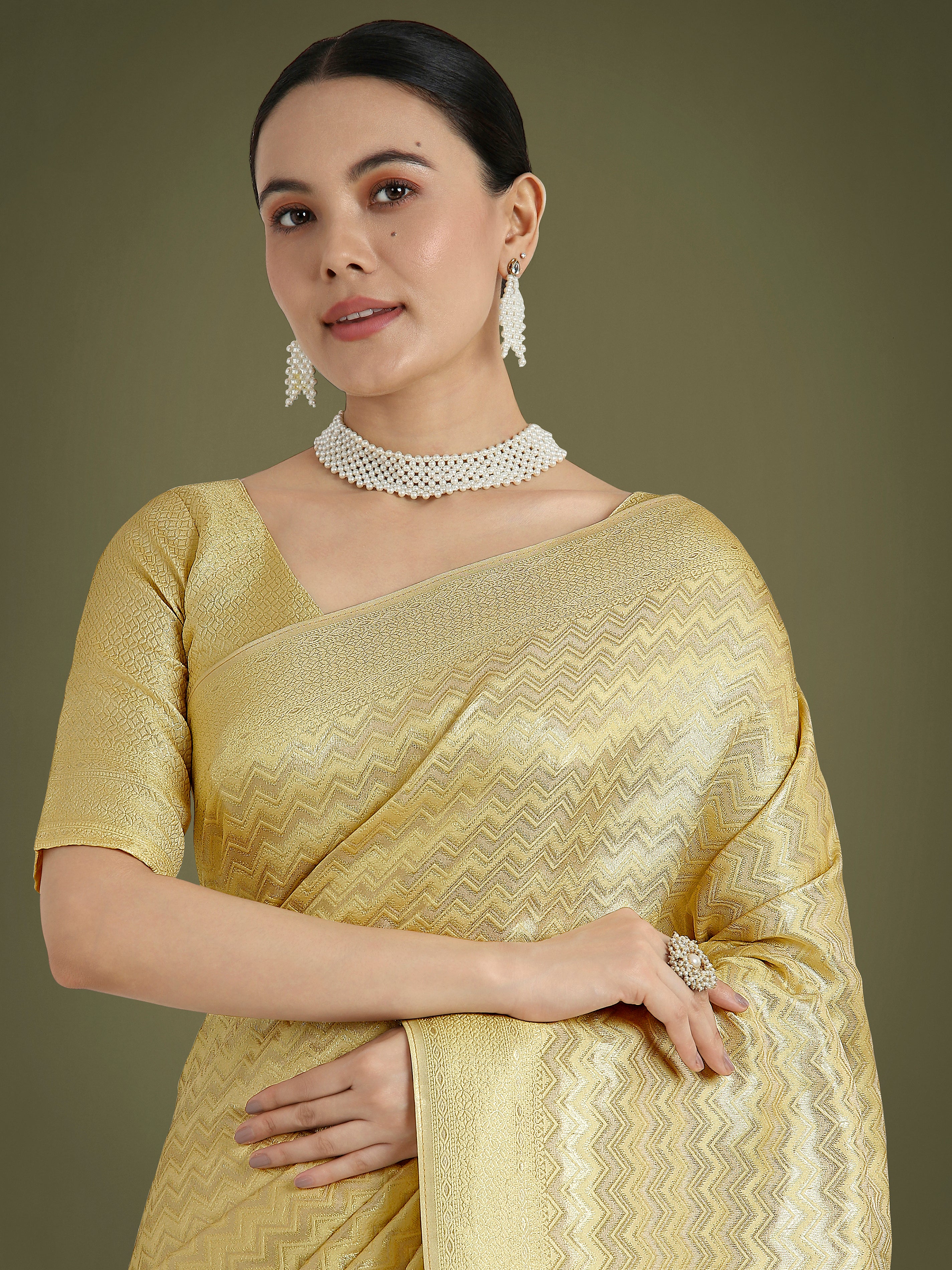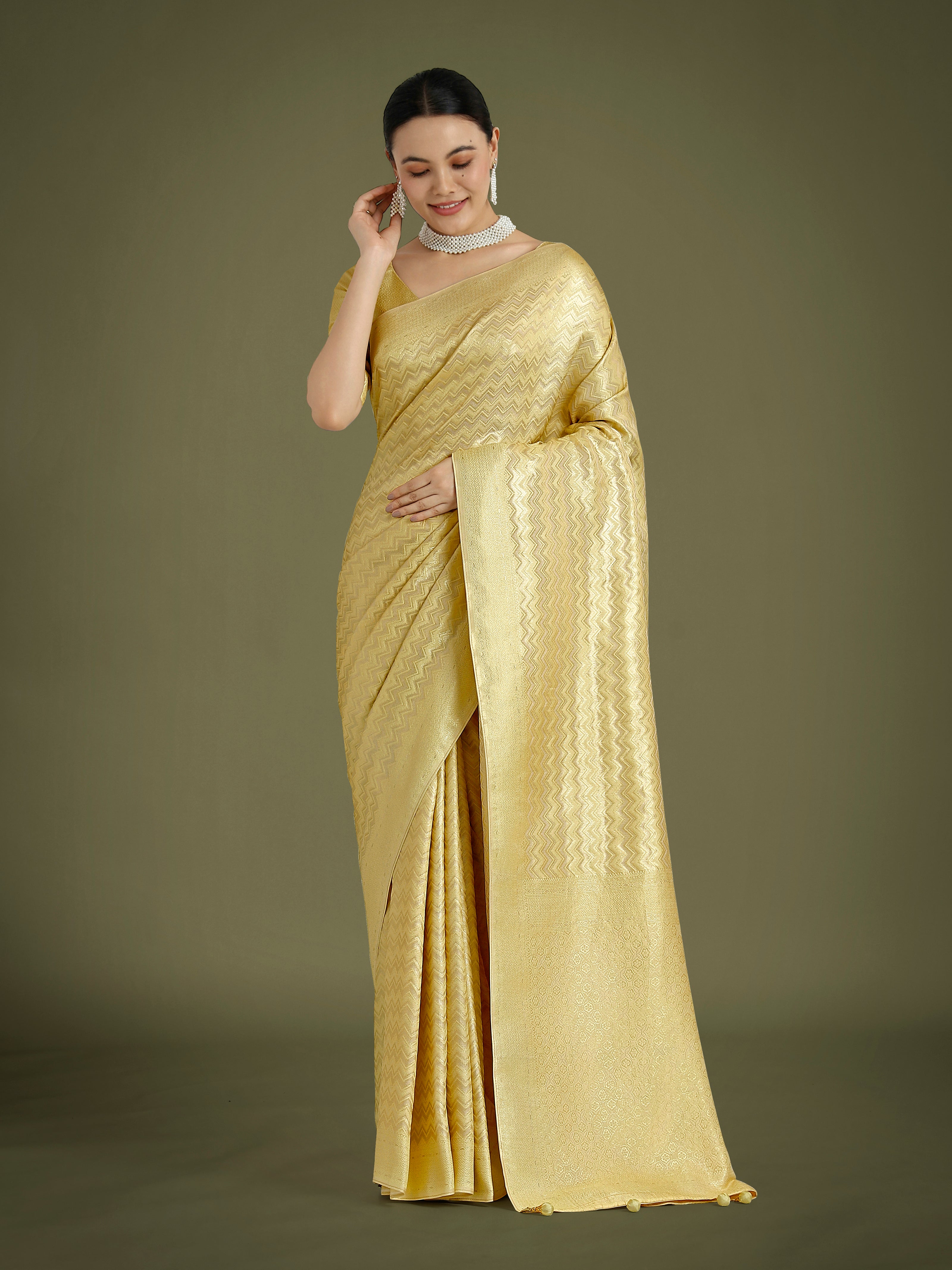 Pamper the women in you with this appealing Light Yellow Banarasi satin silk classic saree. The ethnic weaving leheriya pattern with zari work in the attire adds a sign of attractiveness statement for the look. Comes with matching blouse. (Slight variation in color, fabric & work is possible. Model images are only representative.)