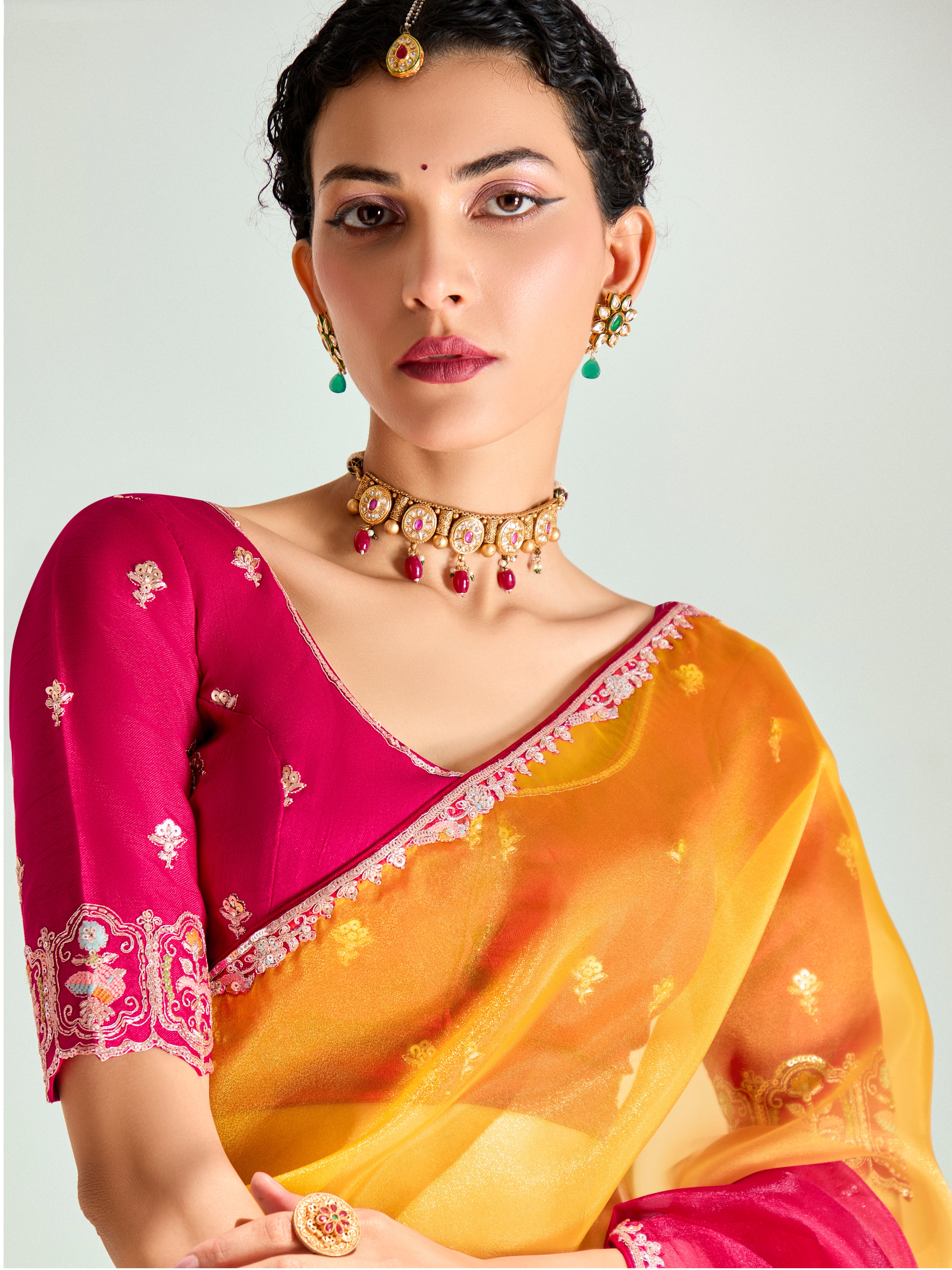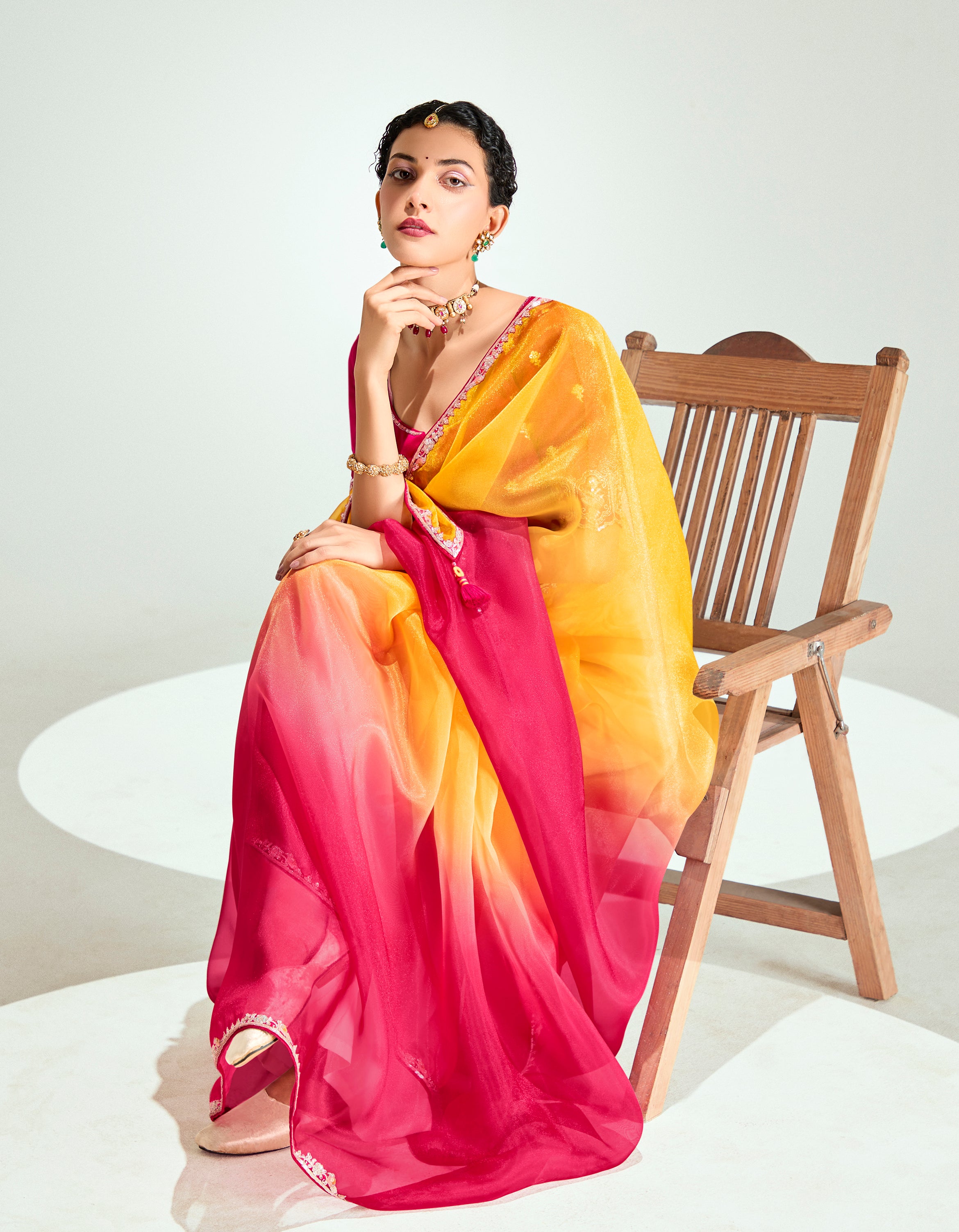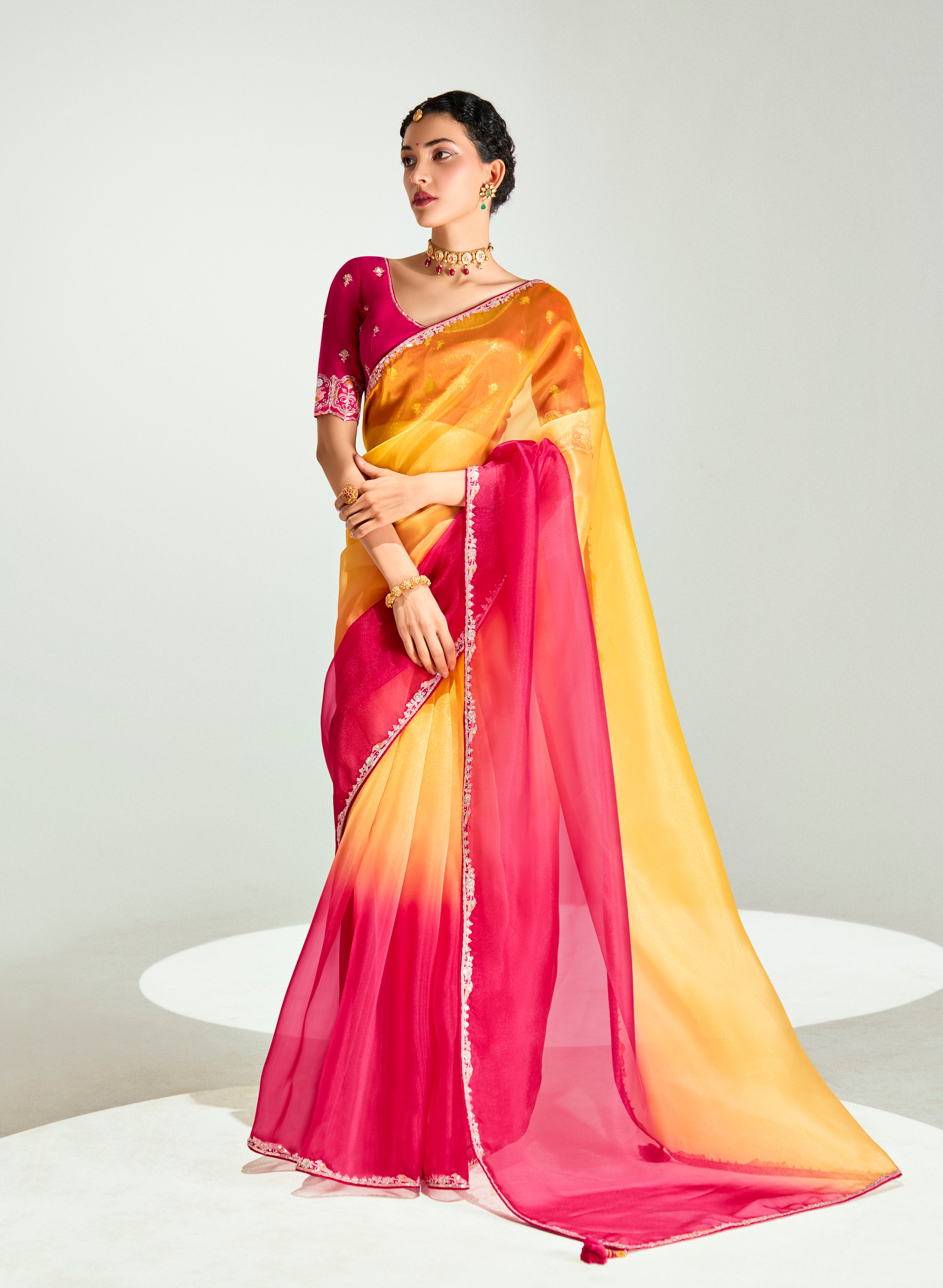 This Rani Pink and Yellow Shaded Tissue Organza Saree is a delightful mix of soft charm and intricate craft, perfect for your festive and traditional moments. Made from lightweight tissue silk, it dazzles with hand-embroidered resham thread, sparkling sequins, and playful tassels along the border and pallu. The matching satin silk blouse is a showstopper too, featuring handwork embroidery with beads and sequins on the neckline, sleeves, and back.