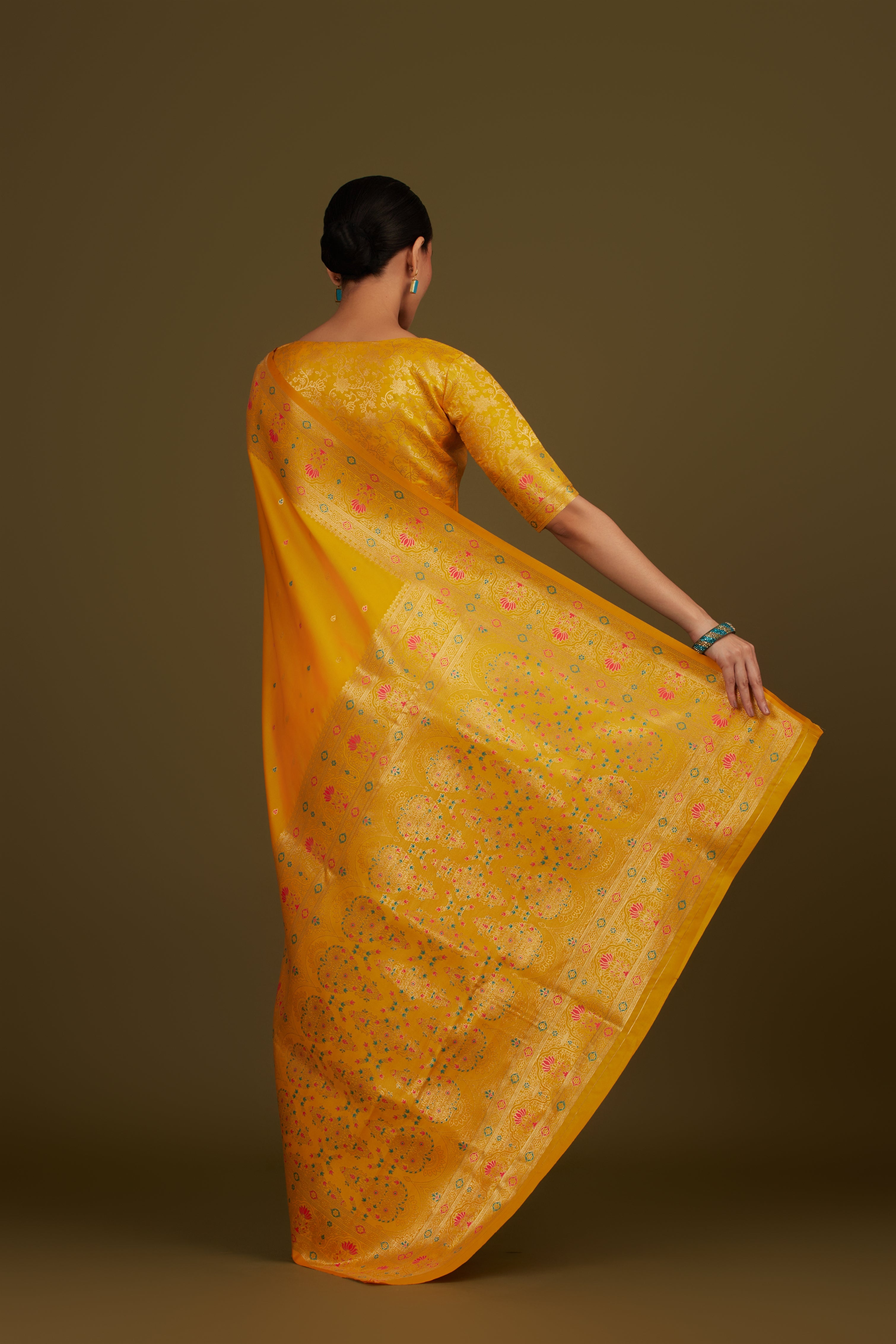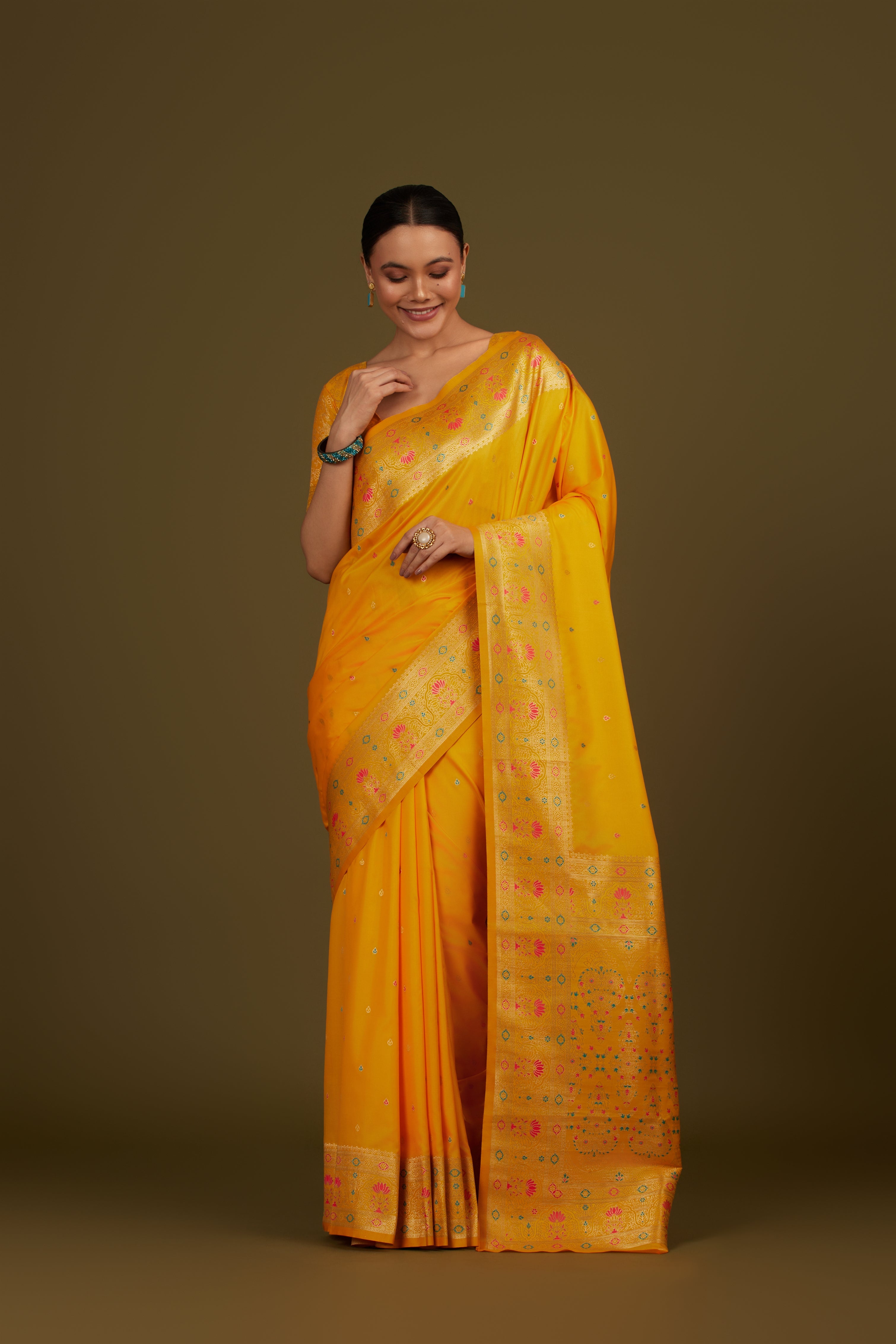 Be an angel and create and ascertain a smashing effect on anybody by carrying this Yellow color silk contemporary saree. The fancy, weaving and zari work seems chic and fantastic for any occasion. Comes with matching blouse. (Slight variation in color, fabric & work is possible. Model images are only representative.)