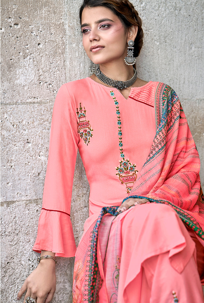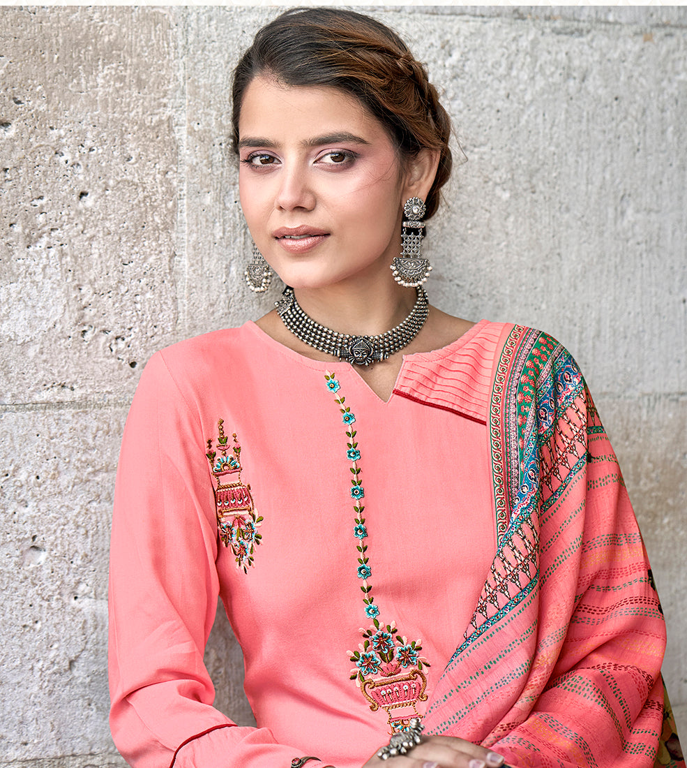 Be your own style icon With Rose Pink color Rayon salwar suit. This attire is encrafted with embroidered, thread and zari work. Comes with matching Rayon Bottom and heavy maslin digital print dupatta.