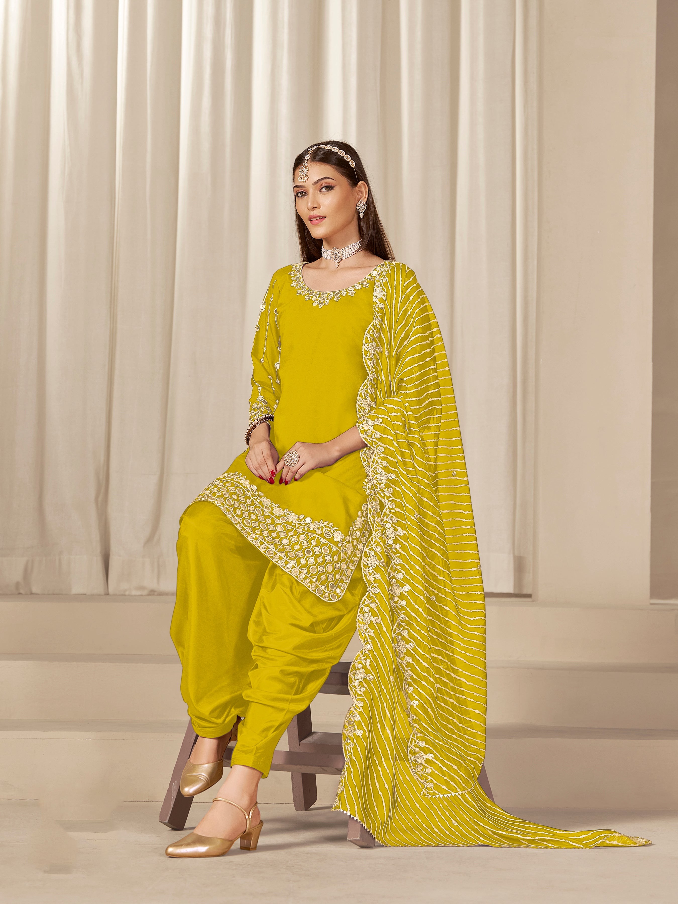 Real magnificence can come out through the dressing trend with this yellow roman silk patiala salwar suit. The gorgeous mirror, sequins, thread and zari work a vital attribute of this attire. Comes with matching bottom and dupatta. (Slight variation in color, fabric & work is possible. Model images are only representative.)