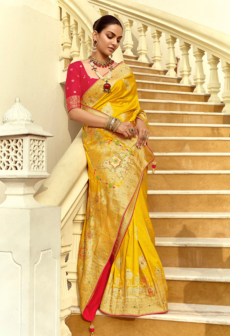 Saree Colour : Yellow || Blouse Colour : Crimson